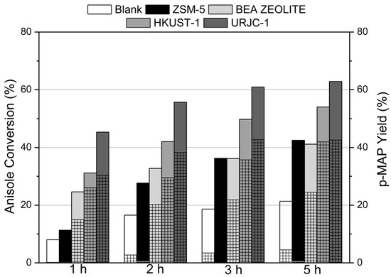 In the case of the acylation of anisole, URJC-1 material was studied and compared with other catalysts typically used for this reaction, like Cu-based MOF material (HKUST-1) and some conventional microporous zeolitic materials (Beta and ZSM-5), using the same operation conditions of previous works [12,30]. Figure 9 shows the catalytic performance in terms of anisole conversion and p-methoxyacetophenone (p-MAP) yield as the final product for all materials, including a blank experiment with no catalyst. All the catalysts showed a better performance than the blank experiment. Among the tested materials, URJC-1 exhibited the best catalytic activity. Note that URJC-1 has lower surface area (408 m2/g) than HKUST-1 (708 m2/g). In these materials, the catalytic activity is related to the active role of unsaturated copper centers as Lewis acid sites. Regarding the zeolitic materials, it was also remarkable not only the higher anisole conversion for Cu-based MOF materials but also the enhancement of p-MAP yield. Nevertheless, taking into account the reaction rate referred to the number of catalytic sites, also known as turnover frequency (TOF), MOF materials revealed lower values of TOF as compared to zeolitic samples of this work (see Table S2) [31]. This fact is probably associated to certain diffusion constraints of the organic reactants to get the metal sites as consequence of stronger interactions of reactants within the metal organic framework. Another hypothesis could be also the different nature of the catalytic sites of assessed samples (aluminum sites in the case of ZSM-5 and BETA materials and copper sites in the case of MOFs). Thus, the higher activity of MOF materials, and in particular of URJC-1, is due to the high concentration of active acid sites per gram of catalyst.