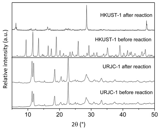Similarly to the other catalytic tests, the stability of the three materials was assessed by comparison of PXRD patterns of the fresh and recovered material after reaction (Figure 12). PXRD patterns of URJC-1 and UiO-66-NH2 materials revealed good stability under the conditions of Knoevenagel condensation reaction. In contrast, the HKUST-1 material showed a partial collapse of the structure, as shown by the disappearance of some characteristic diffraction peaks of its structure.