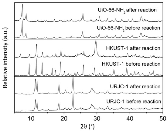 PXRD patterns of URJC-1, UIO-66-NH2, and HKUST-1 materials before and after Knoevenagel condensation of benzaldehyde with malononitrile.