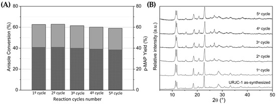 Reusability of URJC-1 as a catalyst was also assesed in both reactions, carrying out until five consecutive reaction cycles at the same operation conditions described in the experimental section. The structural stability of the materials was evaluated after each reaction cycle by PXRD. The results displayed in Figure 13A evidence a catalytic activity practically constant in terms of anisole conversion and p-MAP yield for five reaction cycles of 5 h each. Additionally, PXRD patterns of the catalyst after each reaction cycle confirm the stability of URJC-1 structure, demonstrating again a remarkable chemical stability (Figure 13B).