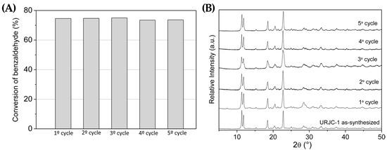 (A) Catalytic performance of URJC-1 in several Knoevenagel condensation reaction cycles; and (B) X-ray diffraction patterns of fresh and used URJC-1 catalyst after several Knoevenagel condensation reaction cycles.