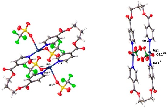 | {Ag(L1)CF3SO3}2 (1) | 238, 270, 325 | 378 | 443/467 | 0.95/1.20 | 0.150, 0.140 |