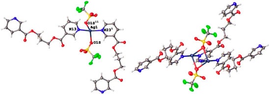 | {Ag(L2)CF3SO3}n (3) | 328, 424 | 323/362 | 444/476 | 1.07/1.21 | 0.158, 0.205 |