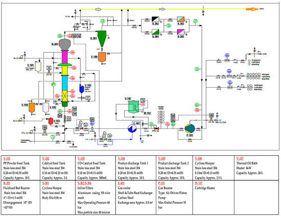 A pilot-scale fluidised bed catalytic reactor was built to conduct the gas phase polypropylene production, comprising of a fluidised bed and a disengagement section. The detailed schematic diagram and a 3D illustration of the production process are shown in Figure 1 and Figure 2 respectively. The height of the fluidised bed was 150 cm and the diameter was 10 cm. The volume of the disengagement region was fixed at 625 cm2. A specially-fabricated catalyst container was installed at a point 9 cm higher than the metallic distributor mesh. The final product haul out points were set at three different heights above the distributor plate. To maintain proper mechanical stability inside the reactor system, the granulated polymer powder was always retained.
