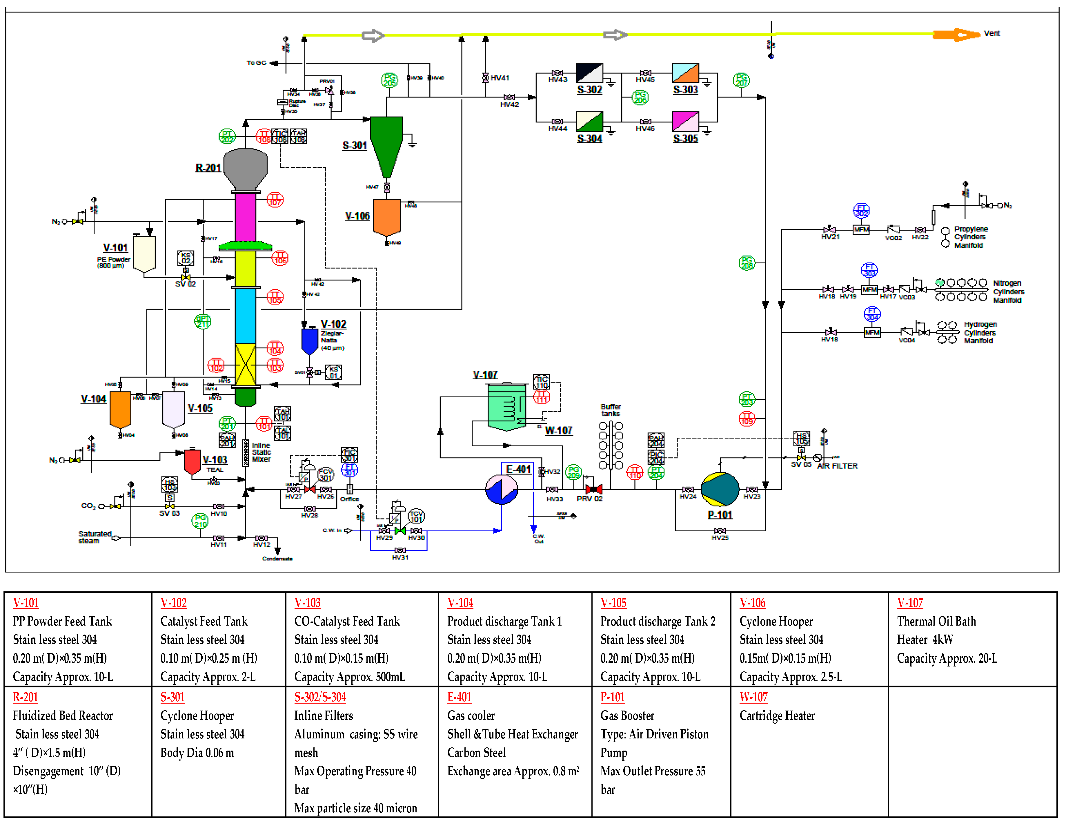 As temperature control is a very sensitive issue for fluidised catalytic polymerisation reactions, the system was kept within a 70–80 °C range. To achieve the reaction initiation temperature, a heater was used to heat up the inlet gas mixture. To obtain a detailed temperature profile in the system, six temperature sensors were installed vertically at different points of the pilot plant, starting at 16 cm above the metallic mesh. The unused gases were passed through a heat exchanger to be cooled down, as the mixture had a higher temperature than required. The cyclone was integrated with four filters, equipped to eliminate fines entrained from the reactor. For the purpose of keeping the system pressure always stable, an air plunge compressor was used. A control valve was attached to the reactor system, to regulate the inlet flow and flow circulation inside the reactor. A nitrogen gas cylinder, used as a buffer container, was installed to balance pressure fluctuations. Several gas cylinders of propylene, nitrogen, and hydrogen were used for feedstock loading. The co-catalyst was dosed after confirming and fixing the gas composition. The objective of injecting the co-catalyst was to keep the moisture level below 2 ppm and activate the catalyst, which is a prerequisite for manufacturing commercial grade polypropylene. The mass flow for the co-catalyst was adjusted by the control valve, which revolves at a regular, very fast speed, and injects the co-catalyst into the reactor. In the pilot plant, unreacted gases were recycled through the cyclone and four filters described earlier. The Ziegler-Natta catalyst container was always kept above atmospheric pressure with nitrogen, to avoid contamination. Three different gas purifiers were added to the source line of propylene, hydrogen, and nitrogen, to remove traces of O2, H2O, CO. Three flow meters were used to measure the flow feed gases. The system was fabricated to withstand a maximum pressure of 30 bar. A relief valve, pre-set at 30 bar to avoid over pressure inside the system, was placed at the top of the reactor.