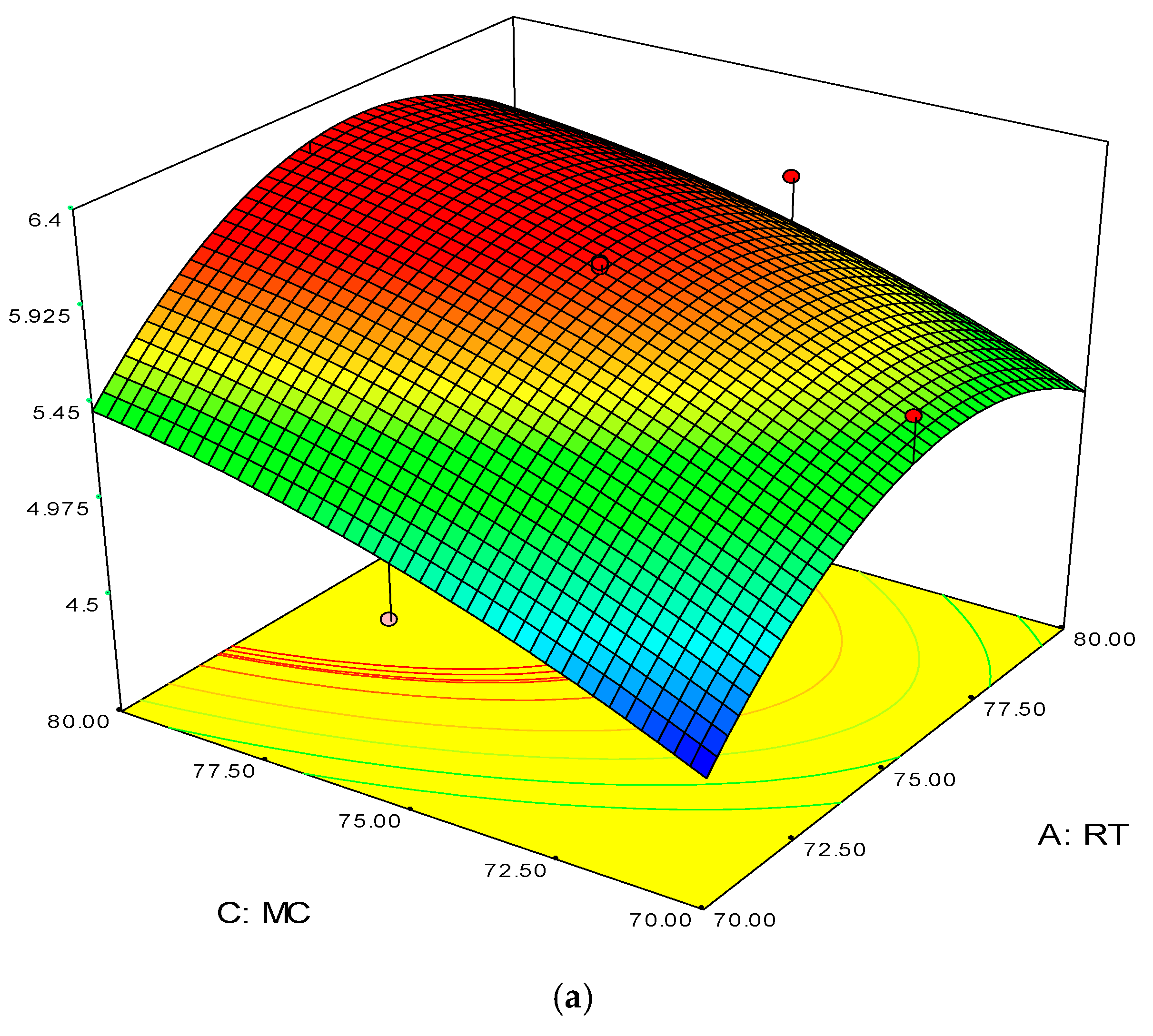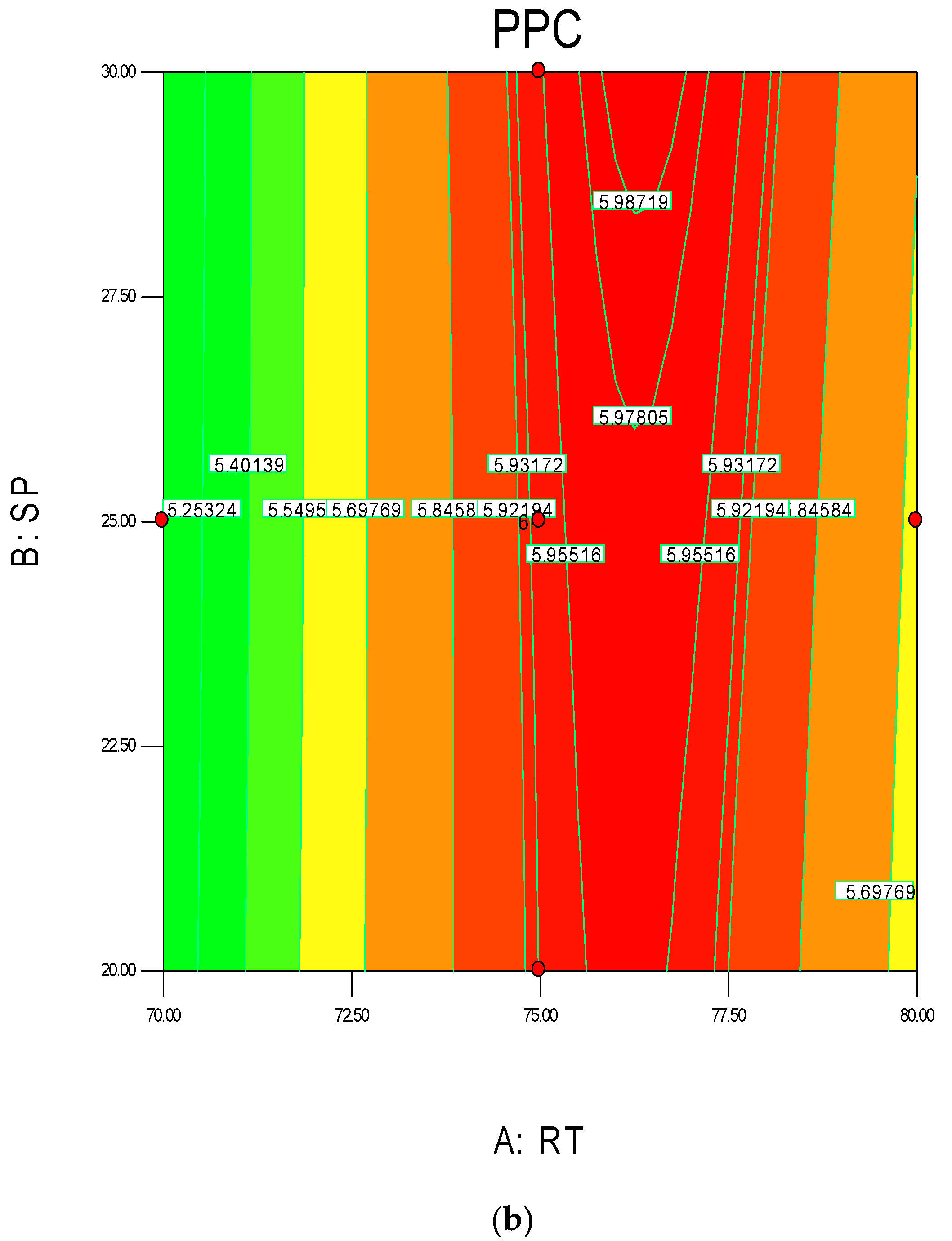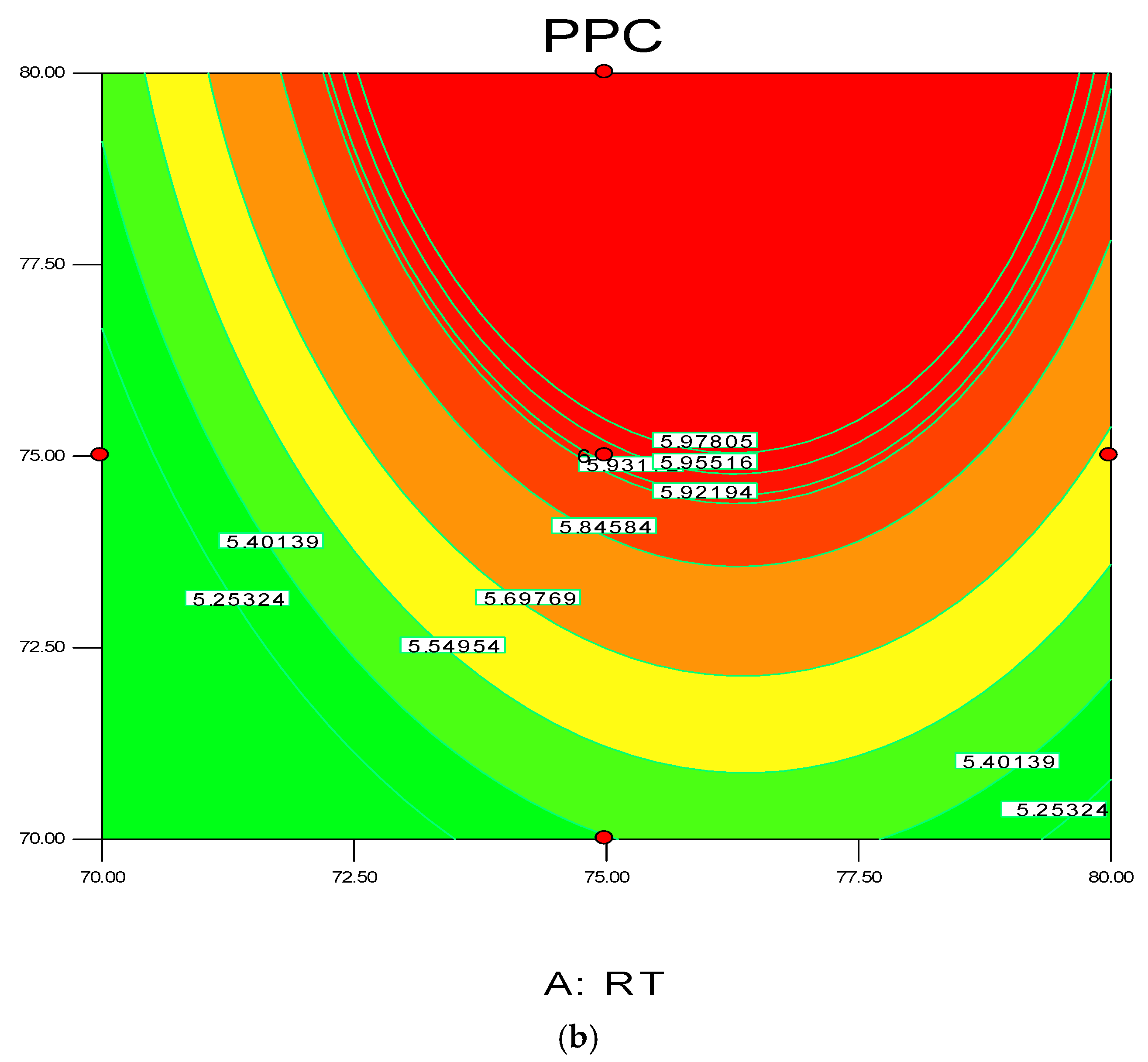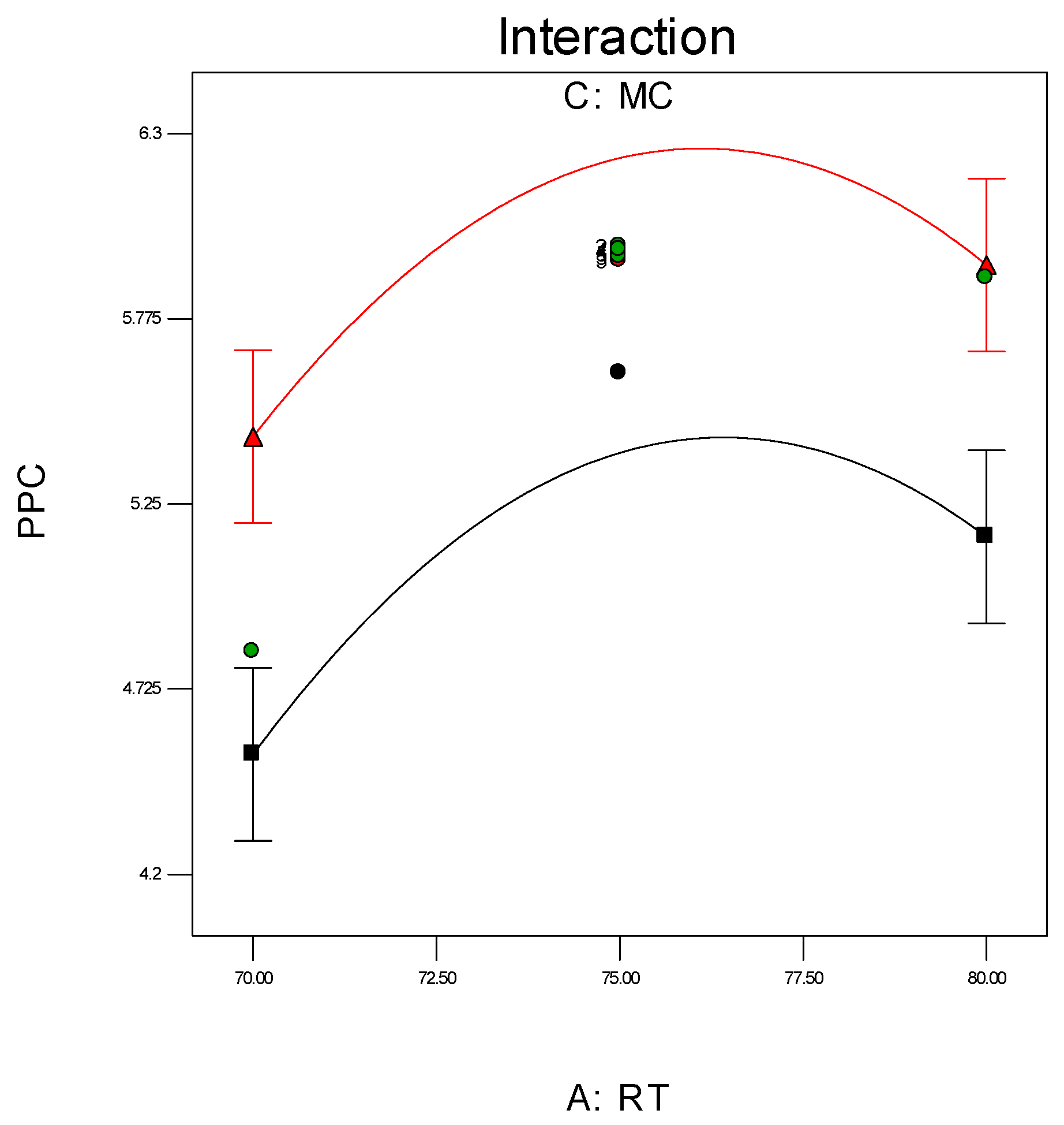 | Run | Factor A RT (°C) | Factor B SP (bar) | Factor CMC (%) | Response, Yppc, (%) (Actual) |