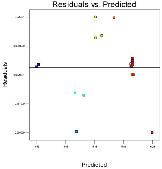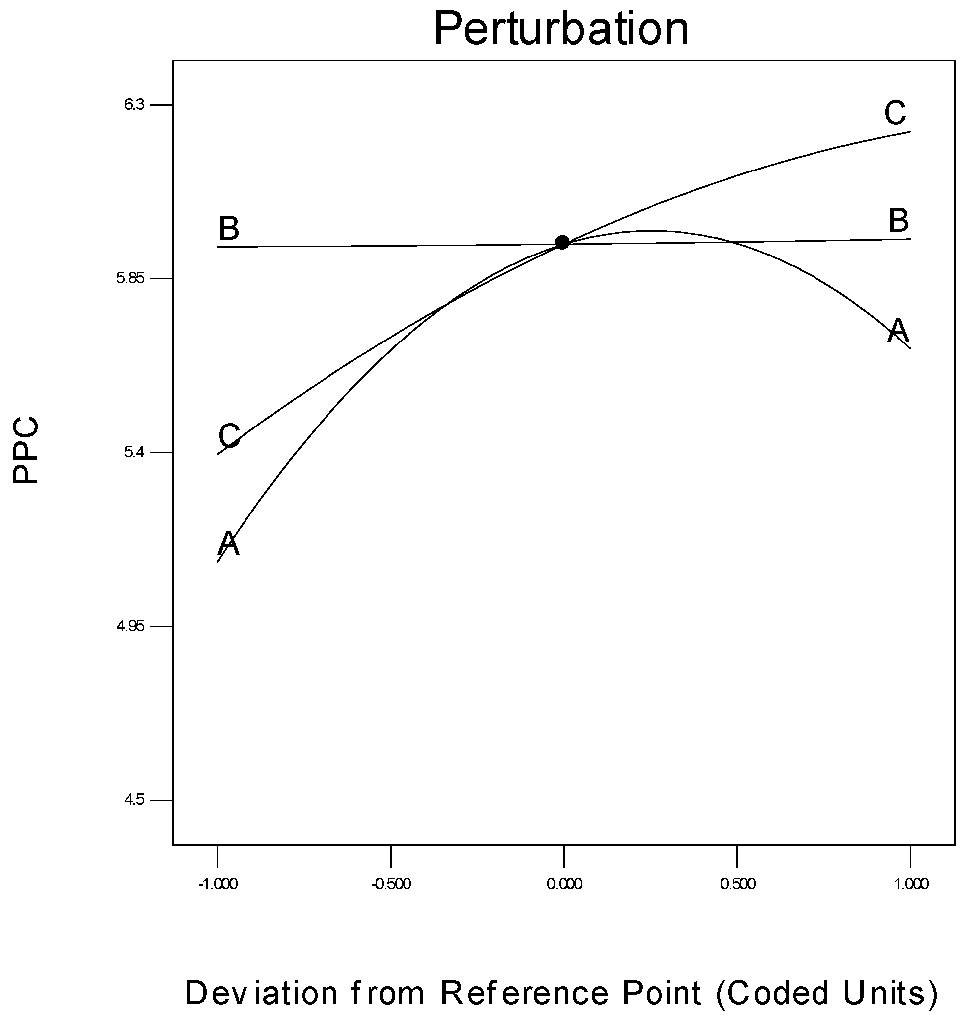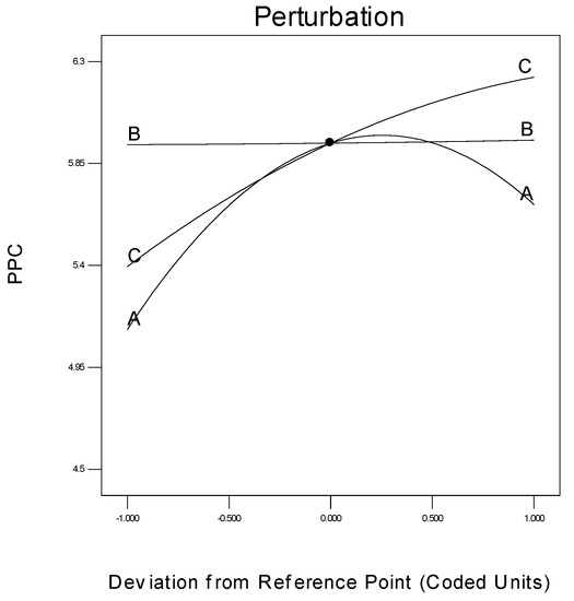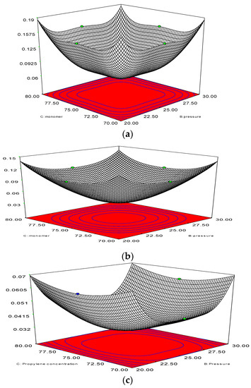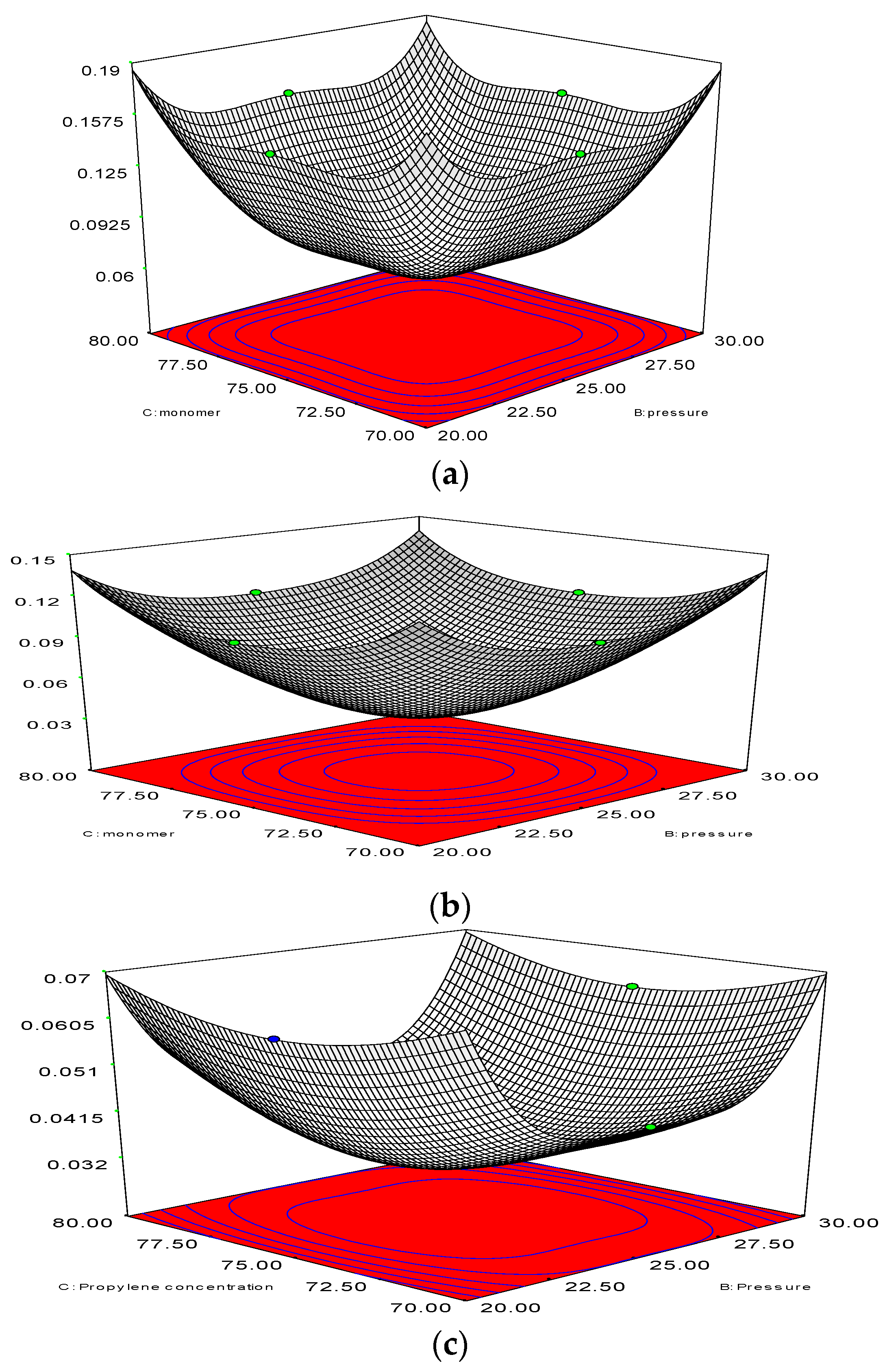In Equations (3) and (4), SSQ is the sum of squares, and DgF the degrees of freedom from the ANOVA table. The three-factor experiments were conducted at the design centre to evaluate the pure error and were carried in randomised order, as required in many design procedures. Reaction temperature (A), system pressure (B), and monomer concentration (C), were selected as the input process variables. Reaction temperature refers to the temperature maintained at the reaction start-up point, while system pressure refers to the prerequisite pressure inside the system. For fluidised bed polymerisation, a minimum pressure of 20 bar is mandatory for a reaction, although pressure can be raised to 30 bar. The coded value with lowest (−1) and highest (+1) icons and physical properties of the polymerisation process are given in Table 1.