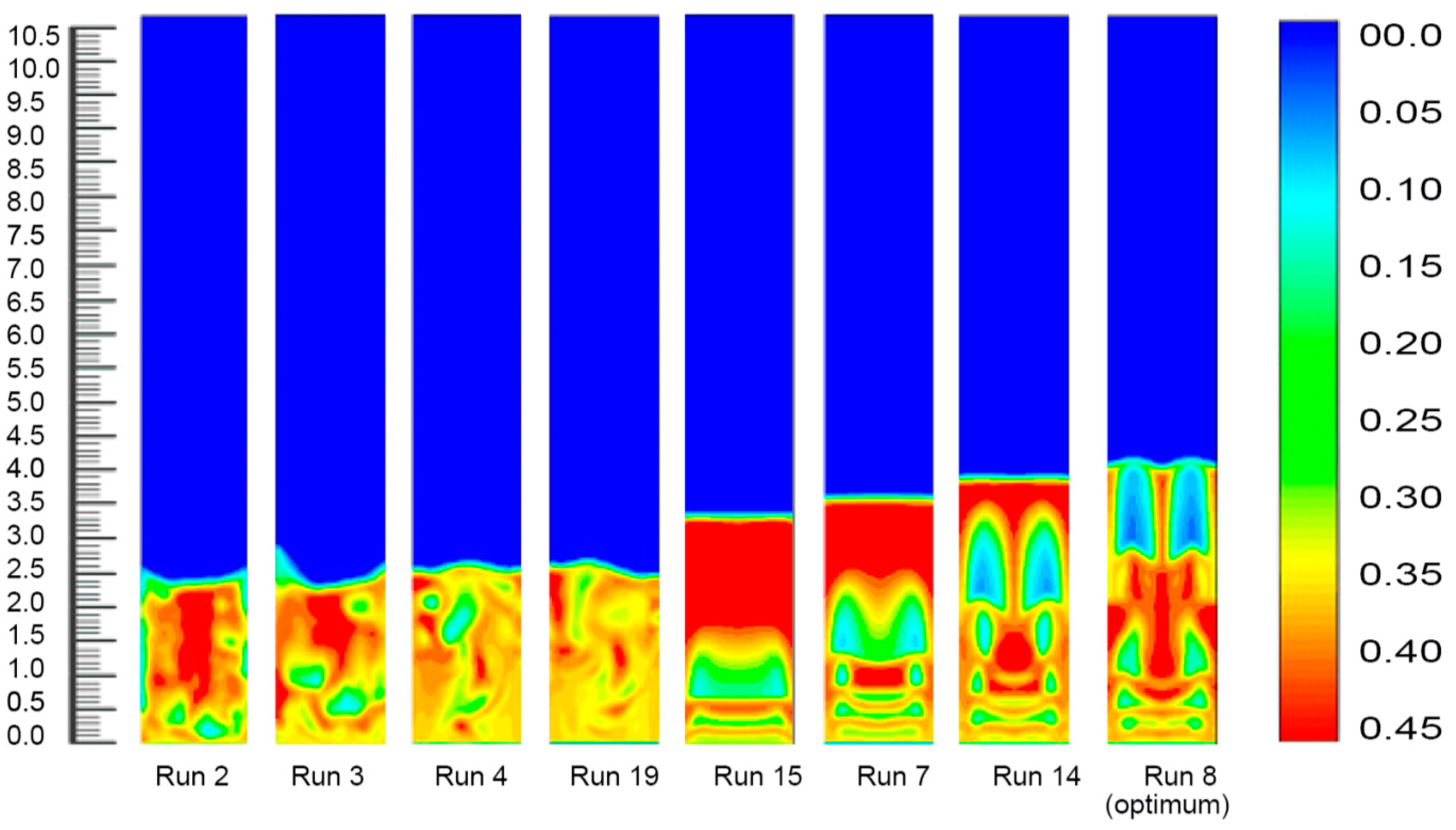 The value of in this study was set at 0.9, but the value can be adjusted according to the particle type. The granular temperature is proportional to the kinetic energy of the fluctuating particle motion. The function is a distribution function that governs the transition from the minimum fluidisation velocity. The simulation criteria for the pilot scale fluidisation study generally suggest and advise that the gas velocity be varied from three to seven times that of the minimum fluidisation velocity [12,45]. Since the ANSYS FLUENT provides a default value of 0.63 for a minimum fluidisation value of 0.1 m/s was considered for the simulation in this study.