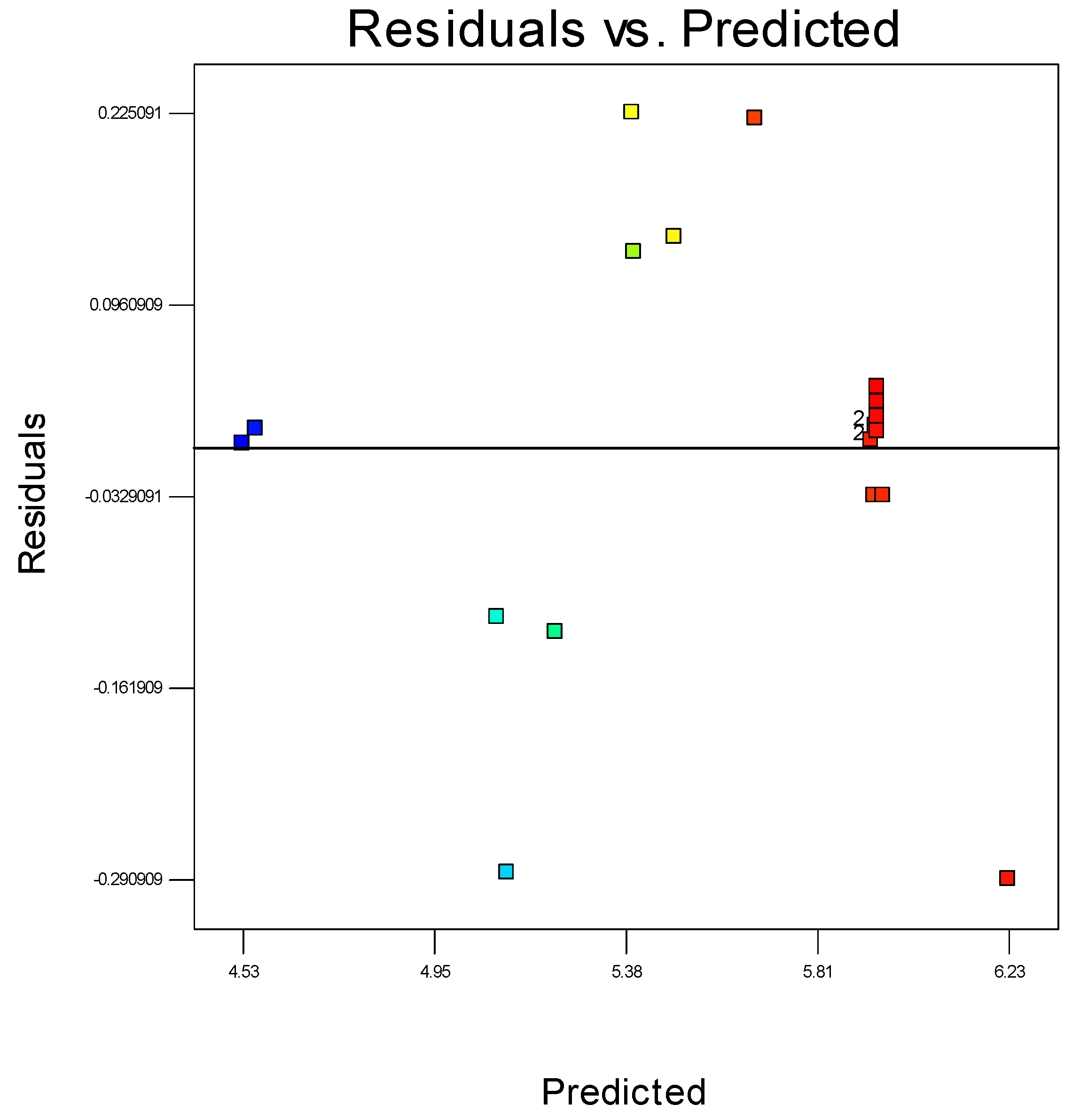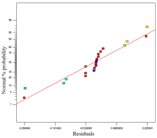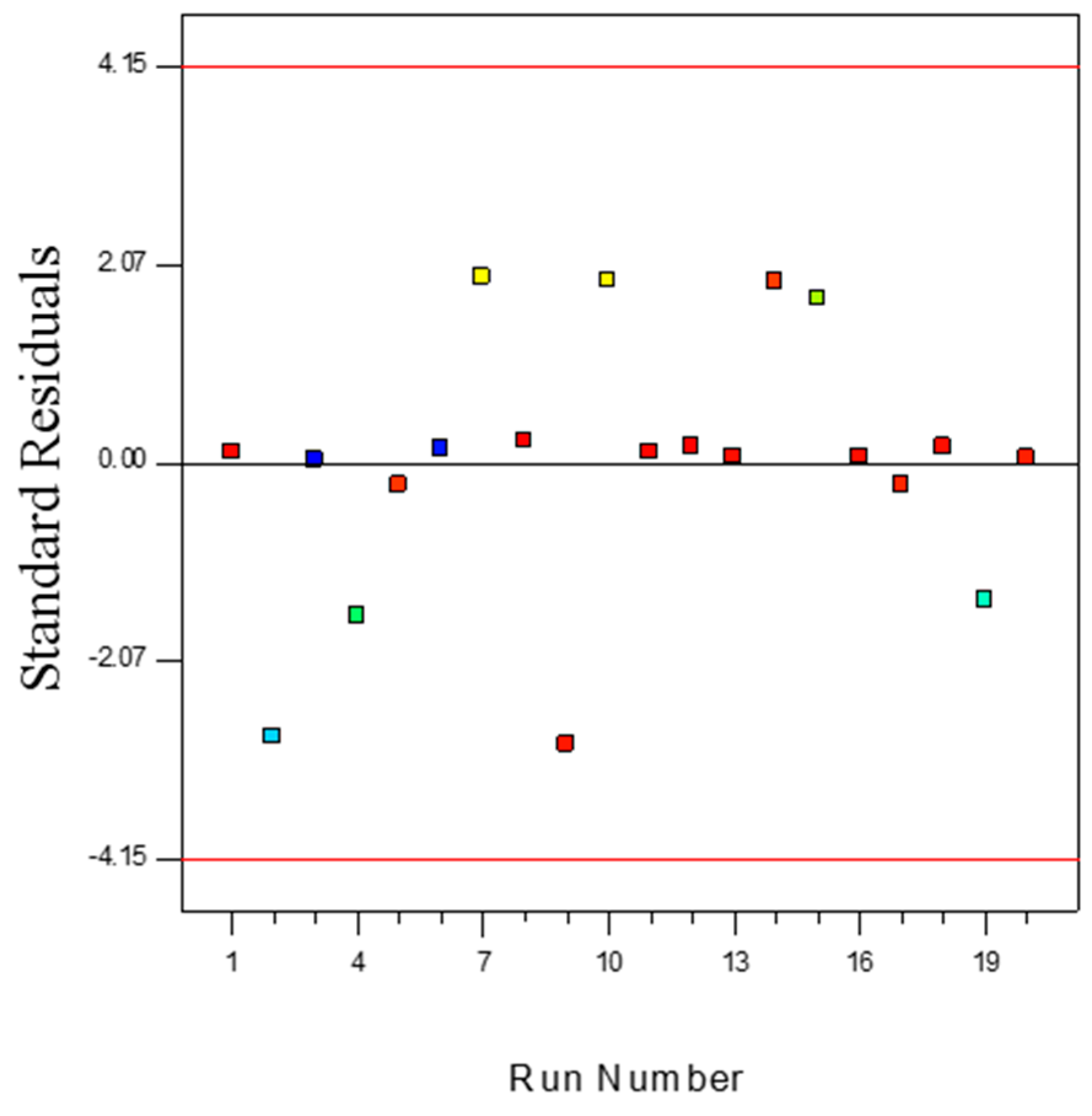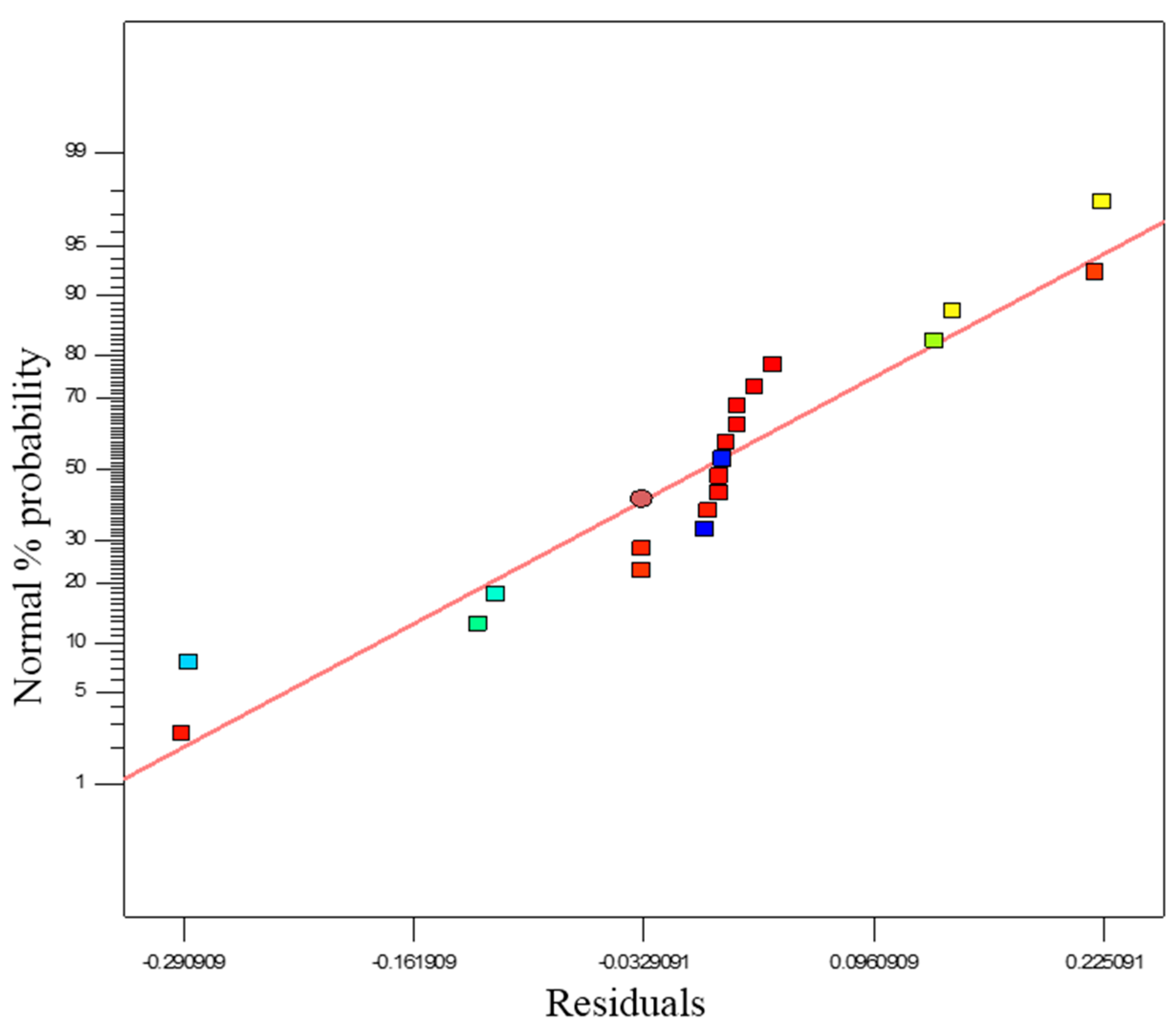 One of the main concepts of the hypothesis is to apply the well-recognised central composite design [16,28] to propose easy to understand and industrially applicable optimum process parameters, together with their detailed interaction along with fluidised bed dynamic behaviours. The robustness of the experimental design is also discussed in terms of the composite design, and emphasis on constructing an adequate precision ratio, the analysis of variance (ANOVA), and the significance of second-order models, determined by the F-value, normal percentage probability, and an interaction graph. The quadratic model provides better evaluation capability for the response surface, and is given in general and actual equations. The face-centred option was chosen to attain the least possible number of experimental runs and the highest possible 3D value.