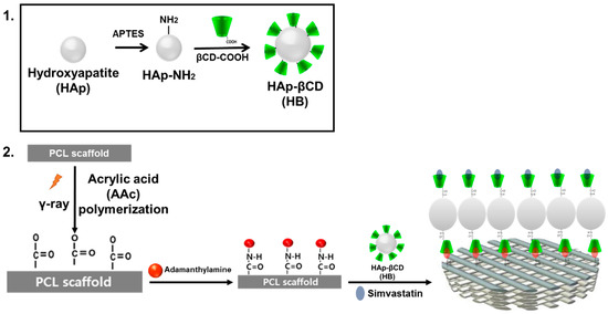 Schematic illustration of hydroxyapatite coated 3D poly(ɛ-caprolactone) (PCL) scaffolds. (1) Preparation of β-cyclodextrin (βCD)-grafted hydroxyapatite (HAp) and (2) HAp coating and simvastatin loading on the surface of adamantane (AD)-modified PCL scaffold.