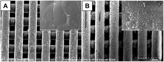 Scanning electron microscopy (SEM) images of β-cyclodextrin (βCD)-grafted hydroxyapatite (HAp)-coated poly(ɛ-caprolactone) (PCL) scaffolds (A) without and (B) with adamantane (AD) grafting.