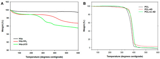 Thermal gravimetric analysis (TGA) of (A) surface-modified hydroxyapatite (HAp) composites and (B) HAp-coated poly(ɛ-caprolactone) (PCL) scaffolds.