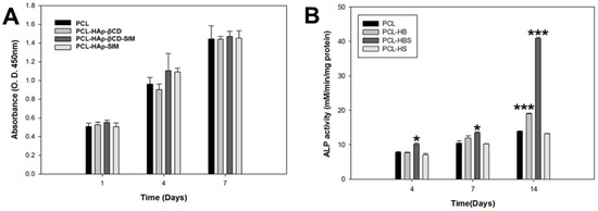The initial loading amount of SIM on the HAp-βCD-coated PCL scaffold was 9.56 µg/mg, and 100% of SIM was released after 14 days (data not shown). Proliferation of hADSCs was measured using the CCK-8 assay kit at 1, 4, and 7 days post culture. Figure 5A shows that there was no observed cytotoxicity among all groups and demonstrated similar proliferation patterns. Figure 5B shows ALP activities of hADSCs on the test PCL scaffolds. Commonly, ALP activity is an early marker of immature osteoblast activity. Moreover, it has been described that ALP cleavage of organic phosphate plays a role in the mineralization of the extracellular collagenous matrix by providing calcium and phosphate ions to generate new formation of the cell-mediated calcium phosphate mineralized matrix [25,26]. Elevated levels of ALP activity were noticed on HAp-coated PCL and SIM-loaded HAp-coated PCL scaffolds at day 14. The ALP activity was significantly higher on the HAp-coated PCL and SIM-loaded HAp-coated PCL scaffolds than the PCL control scaffold at 14 days of cell culture.