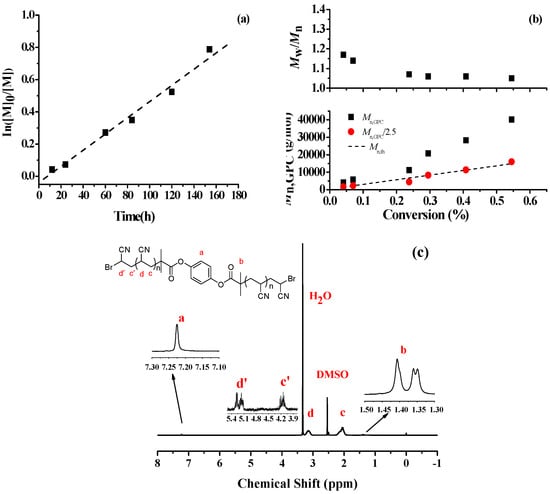 ln([M]0/[M]) as a function of time (a) and number-average molecular weight and molecular weight distribution (Mw/Mn) versus monomer conversion (b) for the initiators for a continuous activator regeneration atom transfer radical polymerization (ICAR ATRP) of acrylonitrile (AN) under ambient pressure; (c) The 1H NMR spectrum of polyacrylonitrile (PAN) (Mn,GPC = 28,400 g·mol−1, Mw/Mn = 1.06, conversion = 40.8%) with dimethylsulfoxide (DMSO) as the solvent and tetramethylsilane (TMS) as the internal standard. Polymerization conditions: [AN]0:[BMPB2]0:[CuCl2·2H2O]0:[TPMA]0:[AIBN]0 = 500:1:0.01:0.1:0.2, VAN = 1.5 mL, VDMSO = 3.0 mL, T = 30 °C under ambient pressure.