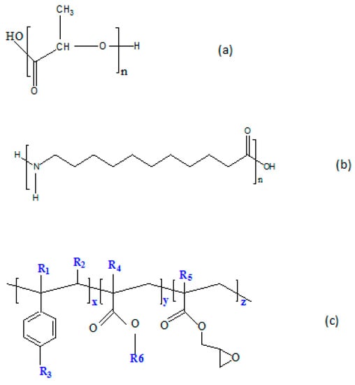 Chemical structure of (a) PLA, (b) PA11 and (c) Joncryl ADR®-4368, and the general structure of the styrene-acrylic multifunctional oligomeric chain extenders. R1–R5 are H, CH3, a higher alkyl group or combinations of them; R6 is an alkyl group. X, Y and Z are between 1 and 20.