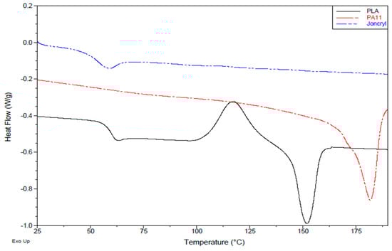 DSC thermograms (second heating cycle) of PLA, PA11 and Joncryl.