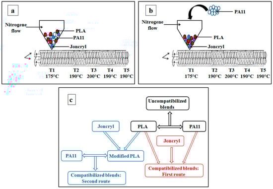 The two strategies of mixing using a corotating twin-screw extruder with a 16-mm diameter: (a) one-step mixing of PLA, PA11 and Joncryl; (b) mixing PA11 with modified PLA; (c) synopsis of the experiment.