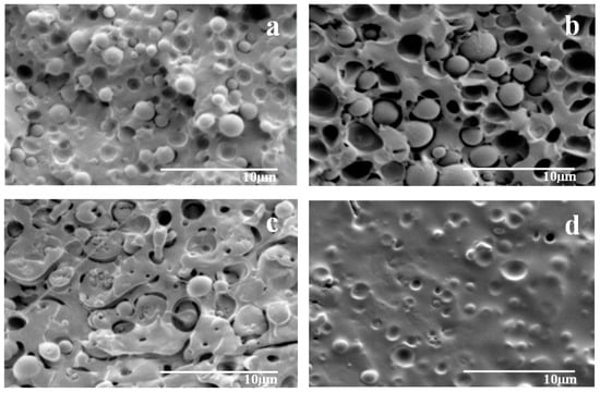 SEM micrographs of PLA_Joncryl/PA11 blends (a) (80_0.7/20), (b) (60_0.7/40), (c) (40_0.7/60), (d) (20_0.7/80).