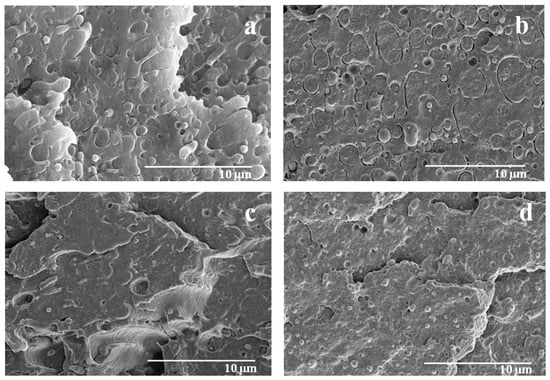 For the PLA/PA11/Joncryl blends obtained with one-step mixing, the SEM micrographs presented in Figure 5 illustrate (i) a notable reduction of the average size of dispersed particles due to a lower interfacial tension; (ii) a significant narrowing of the size distribution of the dispersed phase; (iii) a remarkable decrease of voids at the interface and of empty cavities corresponding to extracted particles; (iv) a better dispersion and more spherical particles of the minor phase; and (v) the disappearance of the co-continuous structure for the 40/60 PLA/PA11 blend.