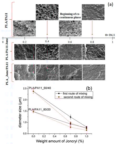(a) Evolution of the morphological structure of PLA/PA11 blends with and without Joncryl as a function of the composition. (b) The average diameter of the dispersed particles versus the concentration of Joncryl.