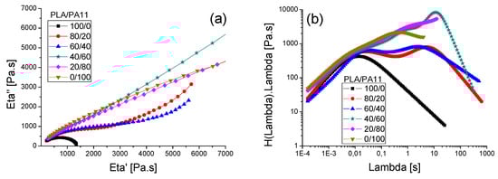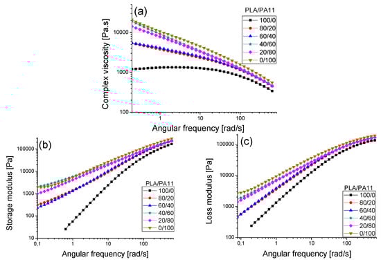 In addition, according to Figure 8b,c, in the whole angular frequency range considered, PA11 demonstrated a highly viscous and elastic behavior. Moduli for the PLA/PA11 blends were located between the values obtained for the neat components. It is clearly highlighted that the viscous and elastic behaviors of these blends were significantly influenced by those of PA11 even at low quantities in the blend (20% of PA11). This rheological behavior was underlined by the change of G’ and G” slopes. Moreover, a higher polyamide 11 content increased both the storage modulus G’ and the loss modulus G’’. This increase was much more pronounced with the storage modulus G’ in the field of low angular frequencies. These results confirmed the efficiency of PA11 in improving the melt viscosity and elasticity of PLA.