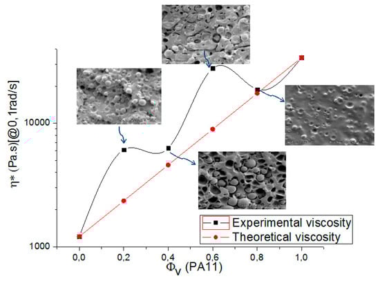 Since there is no Newtonian plateau for PA11 and the modified PLA blends, the reference dynamic viscosity modulus η* (0.1 rad/s) of the neat polymers and their blends was determined as the reference value for the additivity rule (Equation (4)):