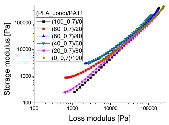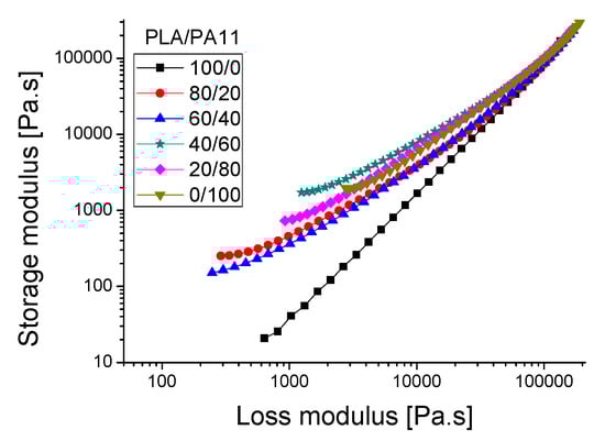 Han plot: the storage modulus (G’) versus loss modulus (G’’) for the PLA/PA11 blends.