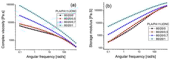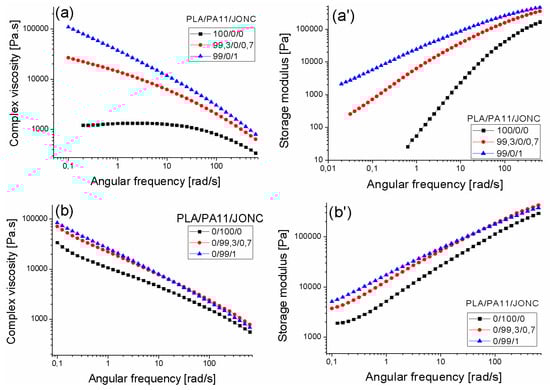 The angular frequency dependence of the complex viscosity modulus and the storage modulus at 190 °C for neat PLA (a,a’) and PA11 (b,b’) and their modified counterparts with 0.7% and 1% of Joncryl.
