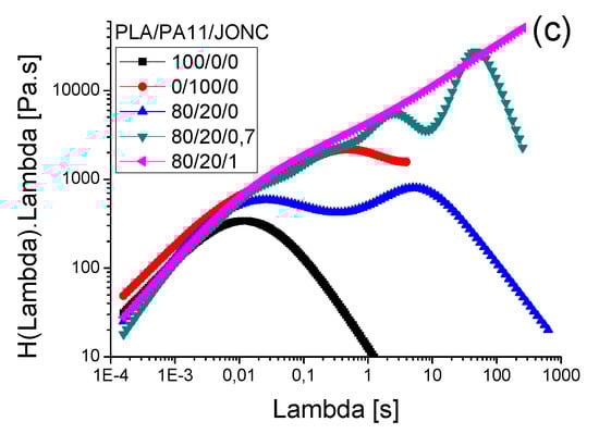 Furthermore, the relaxation spectrum of the PLA_80/PA11_20 blend compatibilized with 0.7 wt % of Joncryl (Figure 13c) clearly showed three relaxation peaks: the first one was related to the relaxation of the PLA matrix (at 0.012 s), the second peak was attributed to the shape relaxation of the dispersed PA11 phase (at 3 s) and finally an additional longer characteristic relaxation peak was visible at 50s and could be attributed to the PLA-Joncryl-PA11 copolymer relaxation. For the blend compatibilized with 1 wt % of Joncryl, the relaxation peaks disappeared, probably indicating the very long relaxation time of this compatibilized blend.