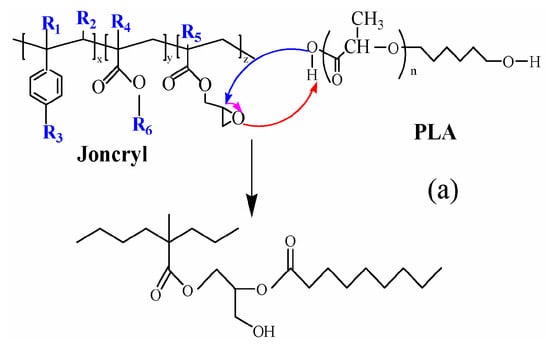 This result revealed once again the occurrence of chemical reactions between the glycidyl methacrylate groups of Joncryl and both the carboxyl (–COOH)/hydroxyl (–OH) end groups of PLA and carboxyl (–COOH)/amino end groups (–NH2) of PA11. In the case of PLA/Joncryl reaction, glycidyl esterification of carboxylic acid end groups precedes hydroxyl end group etherification []. Figure 15a,b respectively illustrate the predicted reactions between PLA and PA11 with Joncryl, and Table 4 lists the different reaction rates of the epoxide with other groups [,].