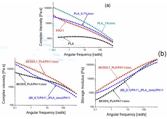 (a) The complex viscosity and the storage modulus versus the angular frequency at 190 °C of the components from the second route of mixing (modified_PLA and PA11). (b) The complex viscosity modulus and storage modulus versus the angular frequency at 190 °C for 80/20/0, 80/20/0.7 PLA/PA11/Joncryl and (80_0.7)/20 (PLA_Jonc)/PA11.