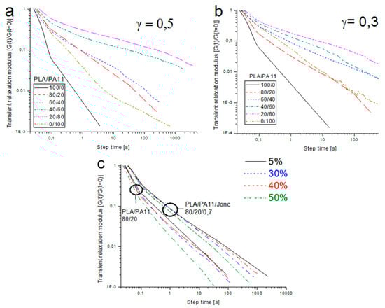 Relaxation moduli G(t,γ) of pure PLA, PA11 and PLA/PA11 blends during the application of a strain of (a) 5% and (b) 30%. (c) Relaxation moduli G(t,γ) of uncompatibilized (PLA/PA11_80/20) and compatibilized (PLA/PA11/Jonc_80/20/0.7) blends during application of strains at different level percentages.