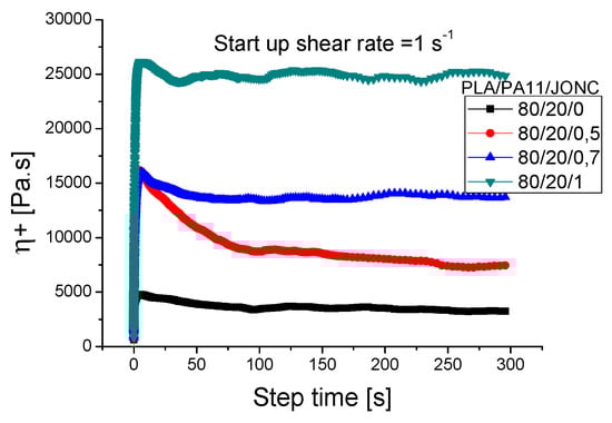 The viscosity growth function η+(γ,t) of the PLA/PA11/Joncryl blends in Figure 19 reveals the nonlinear viscoelastic behavior of the blends. The stress response increased from zero to a steady-state value. Also, a pronounced maximum (overshoot) was observed at short times. It is clearly shown that Joncryl had an important effect on the start-up experiments. In fact, at the same shear rate (1 s−1), the growth viscosity of the uncompatibilized blends was lower than for their compatibilized counterpart and increased with increasing Joncryl concentration. This was believed to be due to the presence of a thick droplet-matrix interface, or a droplet-matrix interphase, with the incorporation of Joncryl []. It is clear that the positions of the overshoots were independent of the weight fraction of compatibilizer [], but their values depended significantly on the amount of Joncryl incorporated. This overshoot probably originated from the formed interface in the PLA-Joncryl-PA11 copolymer and the structural modification of PLA_Joncryl and PA11_Joncryl.