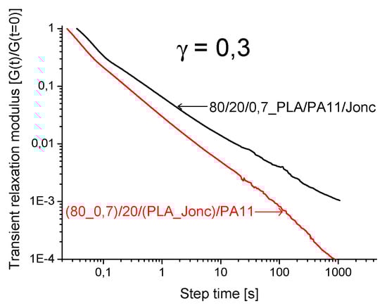Shear stress relaxation measurements G(t,γ) of the neat PLA, PA11 and their blends are presented in Figure 18a,b. The relaxation modulus was obtained at a temperature of 190 °C and two different strains: 0.05 (linear regime) and 0.3 (nonlinear regime). It can be seen that the relaxation curves of all blends contained two relaxation steps: the first faster step which probably corresponded to the relaxation of the PLA phase and the second slower step which could be related to the relaxation of PA11 and/or their interfaces.