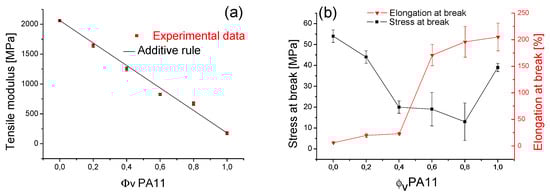 In fact, as illustrated in Figure 21a, the tensile modulus of PLA/PA11 blends covertly obeyed the simple additive mixture law (Equation (5)) and was found to be between the limiting values of the neat polymers (2060 MPa for PLA and 175 MPa for PA11).