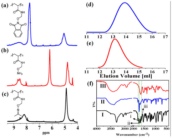 The monomer NAMAm-p was synthesized via Mitsunobu reaction (Scheme 1a) and its molecular structure was confirmed by 1H NMR (Figure S1a, Supplementary Material). Then the PNAMAm was prepared by traditional free radical polymerization of NAMAm-p and one-step deprotection (Scheme 1b). Compared with the 1H NMR spectrum of NAMAm-p, the PNAMAm-p (Figure 1a) gives the peaks at 9.30, 5.17 and 7.84 ppm, which could be ascribed to secondary amine, methylene and phthalimide, respectively, while the peaks of the –CH=CH2 protons (6.10 and 5.67 ppm) was not observed. The result confirmed the obtained PNAMAm-p structure, and also, it well agreed with that found in the FT-IR spectra, wherein the stretching peaks of C=C at 1633 cm−1 disappeared due to the polymerization of NAMAm-p monomer (Figure 1f–I, II).