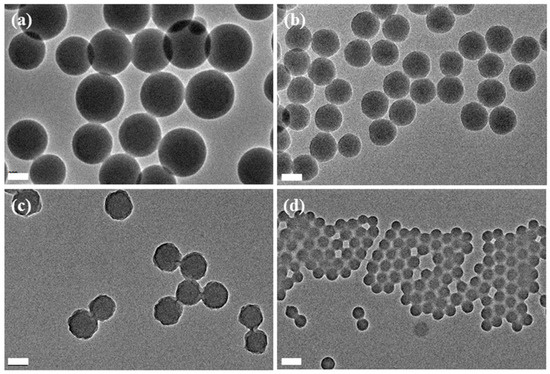 In our experiment, we found that the solid content played a key role in adjusting the thickness of the polymer shell (Figure 5). When the solid content was 0.25%, only ~5 nm polymer shell could be obtained. When the solid content was 0.375%, the shell thickness increased to 30 nm. With continuous increase of the solid content to 0.675%, the shell thickness could be changed to almost 100 nm. This increment trend was also confirmed by DLS (Figure 5e).