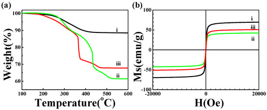 Figure 4. (a) TGA and; (b) VSM curves of (i) MSP; (ii) MSP@PNAMAm-p; (iii) MSP@PNAMAm.