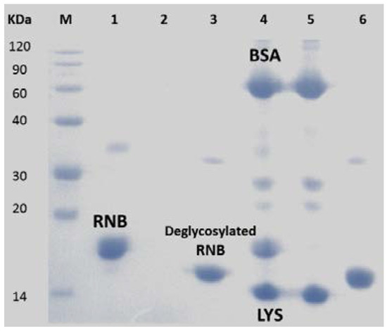 Figure 7. SDS–PAGE analysis of the model glycoprotein proteins before and after treatment with MSP@PNAMAm-1 core-shell microspheres. M stands for protein marker; Lane 1 represents the RNase B; Lane 2 represents the supernatant after enrichment with MSP@PNAMAm-1; Lane 3 represents the released deglycoslated RNB after enrichment; Lane 4 represents the protein mixture of BSA, RNB(RNase B)and LYS(The amount of BSA:RNB:LYS = 1:1:1); Lane 5 represents the supernatant of the protein mixture after enrichment; Lane 6 represents the released deglycosylated RNB after enrichment.