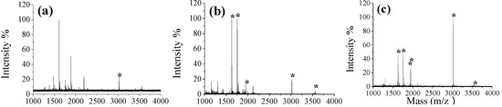 Figure 8. MALDI-TOF mass spectra of the tryptic digest mixture of ASF (asialofetuin) and MYO (myoglobin), the mole ratio of ASF:MYO = 1:10. (a) direct analysis; (b) analysis after enrichment by MSP@NAMAm-1 and deglycosylation by PNGase F; (c) analysis after enrichment by MSP@NAMAm-4 and deglycosylation by PNGase F. The symbols * denote the deglycosylated peptides.