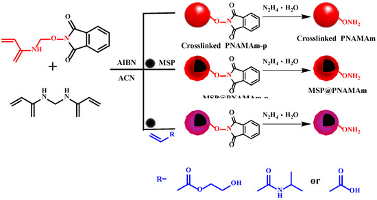 Within the context, we designed a new alkoxyamine-based monomer to directly prepare alkoxyamine-functionalized polymer microspheres with magnetite nanoclusters in core by the RPP route. Phthalamide-protected N-aminooxy methyl acrylamide (NAMAm-p) was synthesized as monomer [41], and it was subjected to the RPP for well controlling the particle size and functional group density. Finally, the tailor-made microspheres were applied in enrichment of glycoproteins and glycopeptides.