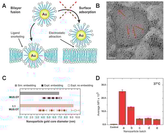 - Van Lehn, R.C.; Atukorale, P.U.; Carney, R.P.; Yang, Y.S.; Stellacci, F.; Irvine, D.J.; Alexander-Katz, A. Effect of particle diameter and surface composition on the spontaneous fusion of monolayer-protected gold nanoparticles with lipid bilayers. Nano Lett. 2013, 13, 4060–4067. [Google Scholar] [CrossRef] [PubMed]