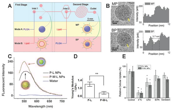 - Zhang, L.; Feng, Q.; Wang, J.; Zhang, S.; Ding, B.; Wei, Y.; Dong, M.; Ryu, J.Y.; Yoon, T.Y.; Shi, X.; et al. Microfluidic synthesis of hybrid nanoparticles with controlled lipid layers: Understanding flexibility-regulated cell-nanoparticle interaction. ACS Nano 2015, 9, 9912–9921. [Google Scholar] [CrossRef] [PubMed]