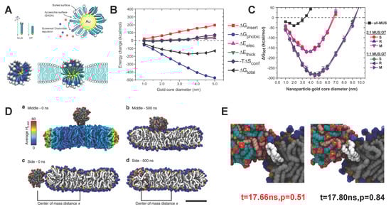 - Van Lehn, R.C.; Alexander-Katz, A. Free energy change for insertion of charged, monolayer-protected nanoparticles into lipid bilayers. Soft Matter 2014, 10, 648–658. [Google Scholar] [CrossRef] [PubMed]
