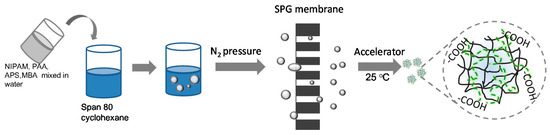 The microspheres were synthesized using suspension polymerization (Figure 1), and the recipes of the water phase are shown in Table 1. Generally, different ratios of NIPAM, PAAc, MBA, and APS were dissolved together in 9.5 mL of deionized water. The pH value of the water phase was adjusted to 4.0 using an HCl solution, and the carboxyl groups of PAAc were not ionized as its pKa was 4.7 [30]. In this pH condition, a hydrogen bond could exist between the carboxyl groups of PAAc and the amide groups of NIPAM. Cyclohexane (100 mL) and 2.5 g of Span 80 were mixed together in a beaker. The water phase was then dispersed into the oil phase at 140 rpm for 30 min. The coarse emulsion was pressed through a micro-porous membrane (the pore size of the membrane was 5.2 μm) under a certain nitrogen pressure, and this preliminarily emulsified emulsion was passed through the same membrane in the next pass. The final water-in-oil (W/O) emulsion was obtained after repeating the above process 1–5 times. The obtained emulsion was bubbled with nitrogen gas to remove oxygen before polymerization. Afterwards, TEMED dissolved in 2 mL of cyclohexane was introduced to accelerate the reaction. The system was kept at 20 °C under a nitrogen atmosphere for 4 h.
