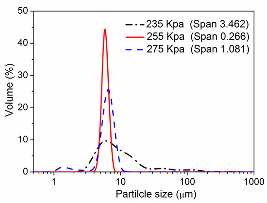 In the premix membrane emulsification process, the preparation of uniform emulsion droplets is based on extruding the primary coarse emulsions through a membrane by a suitable pressure. Thus, the trans-membrane pressure is one of the crucial parameters influencing the size distribution. To investigate the effect of the pressure on particle size, the primary coarse emulsions of semi-IPN3 were pressed through a micro-porous membrane under different trans-membrane pressures, i.e., 235, 255, and 275 kPa. The number of trans-membrane passes used was three, and the other parameters were the same as mentioned in Section 2.3. The relationship between the trans-membrane pressure and the size distribution of the microspheres is shown in Figure 2. It can been observed that the Span values of the resultant microspheres (3.462, 0.266, and 1.081 for 235, 255 and 275 kPa, respectively) were significantly influenced by pressure, and the narrowest size distribution of the microspheres was obtained at 255 kPa. Because they were at a lower pressure, the droplets of coarse emulsions were difficult to break and would pass through the membrane pores by changing their shape. In contrast, a higher pressure caused a faster pass-through rate and promoted the coarse emulsions to cross the membrane at a high speed. In this situation, a large amount of smaller droplets was obtained. Therefore, too low or too high of a trans-membrane pressure could lead to a broad size distribution of the microspheres, and 255 kPa was chosen as the suitable transmembrane pressure to prepare uniform semi-IPN microspheres in the following experiments.