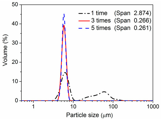 The number of trans-membrane passes is another key factor influencing the uniformity of microspheres. The primary coarse emulsions of semi-IPN3 were pressed through the micro-porous membrane for a different number of trans-membrane passes, and the other conditions were the same as mentioned in Section 2.3. As shown in Figure 3, a large amount of larger particles was obtained when the coarse emulsion was passed through the membrane only one time. The reason for this was that the droplets could not be fully emulsified by passing through the membrane pores only once. When the coarse emulsion was pressed through the membrane three and five times, the larger droplets were broken into smaller ones, and a narrower size distribution was obtained. The size distributions of the microspheres prepared by three and five trans-membrane passes were almost the same. For simplicity of operation, three passes were employed in the following experiments. Similar results have been reported in other studies [28,34].