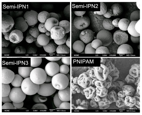 To observe the morphology of the microspheres in solid state, SEM measurements were performed. As shown in Figure 5, the surface of the PNIPAM microspheres were largely deformed compared with those of the PNIPAM–PAAc semi-IPN microspheres, which was due to the uneven collapse of the structure as a result of drying. These figures clearly show that the semi-IPN microspheres were more rigid than the PNIPAM microspheres. Some researchers have reported that the introduction of the semi-IPN structure and linear polymer chains could reinforce the unvarnished hydrogel network [37,38]. Thus, in the present system, it could be considered that the presence of the PAAc chains supported the PNIPAM network, resulting in less shrinkage during the dehydration process. Moreover, the surface of the semi-IPN3 microspheres was smoother than that of semi-IPN1 and semi-IPN2. The reason for this was that the increasing concentration of initiator led to a higher crosslinking density, increasing the rigidity of the microspheres [39].