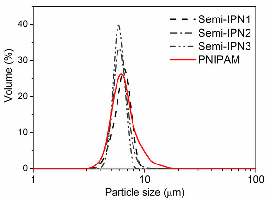 Figure 6 shows the particle size distributions of different microspheres, and Table 2 displays the particle sizes and the yield of the microspheres. It can be observed that the particle sizes of the semi-IPN microspheres (6.7, 6.3 and 6.2 μm, respectively) were similar to those of the PNIPAM microspheres (6.5 μm). However, the Span values of all the semi-IPN microspheres were smaller than those of the PNIPAM microspheres (1.571 ± 0.500), which meant that the size distribution of the semi-IPN microspheres was narrower than that of the PNIPAM microspheres. It has been reported that Span values of less than 1 were considered monosized distributions [40,41]. Thus, the uniform semi-IPN microspheres were obtained, and the average yield of the semi-IPN microspheres was 73%. Remarkably, the particle size distribution of semi-IPN1 was slightly different from those of semi-IPN2 and semi-IPN3, possibly because when the initiator concentration was 1.1 × 10−2 mol/L, the cross-linking density was smaller and the rigidity of the semi-IPN1 microspheres was lower. Hence, a tiny proportion of the microspheres could have been broken during the wash process, which increased the Span value.