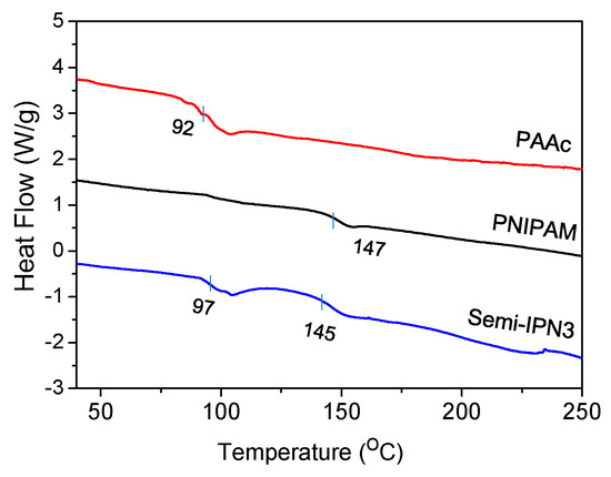 The glass transition temperature (Tg) is a very important characteristic parameter of a polymer as it determines the miscibility of the polymer component. A DSC study was performed on the dried microspheres to obtain the Tg during the heating process, and the calorimetric endotherms are displayed in Figure 8. The Tg of PNIPAM and PAAc were 147 and 92 °C, respectively. PNIPAM–PAAc semi-IPN3 exhibited two Tg values of 97 and 145 °C, which was indicative of a phase-separated structure. Compared with pristine PNIPAM and PAAc microspheres, the Tg of PAAc and PNIPAM in the semi-IPN3 microspheres shifted towards each other. It has been reported that most IPNs form immiscible compositions during synthesis [42]. In addition, it is known from the literature that the Tg of the individual components shift towards each other, indicating a partial mixing of the networks [43,44]. Therefore, the DSC results of the present work showed that an incomplete compatible state existed between the two polymer networks. Meanwhile, the PAAc chains were entangled with the PNIPAM networks and were relatively independent of the PNIPAM networks.
